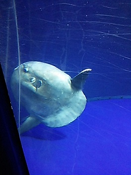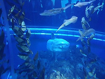 海遊館のマンボウは今 アオリイカと一緒の水槽にいるんですよね~。イカは上の層、マンボウは下の層で、棲み分けてるようでしたが。上から、イカなめのマンボウ写真、パシャリ。ふしぎな光景です。